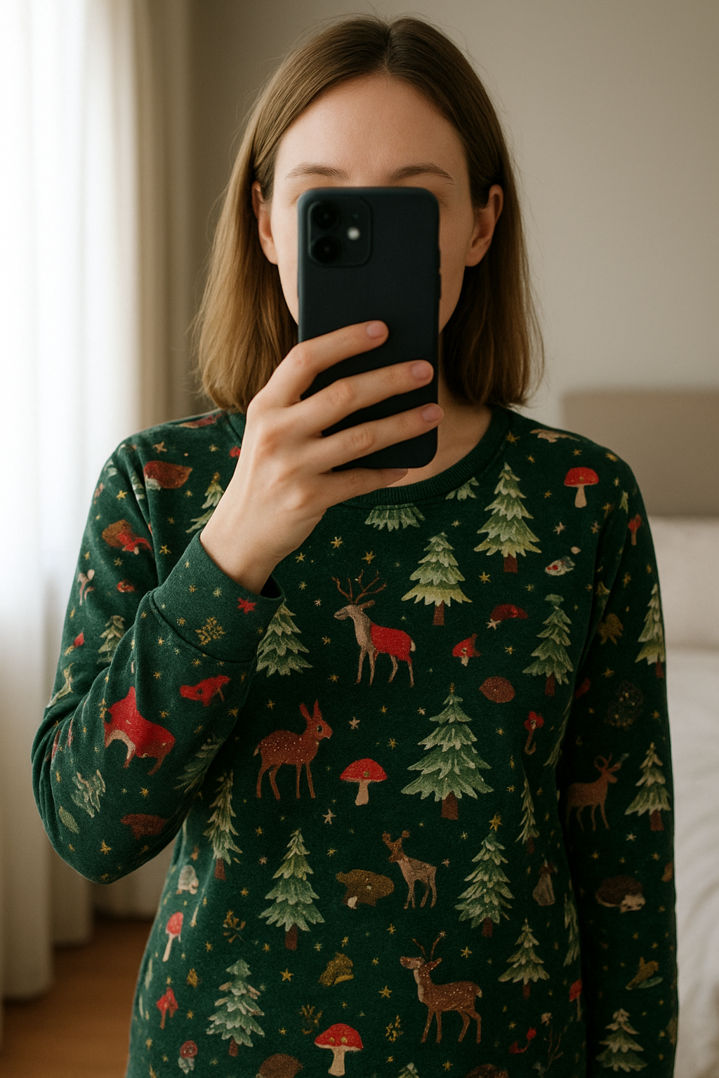 Haut de Noë léger Primark 34/36 XS debout, face à la caméra, dans une chambre à la lumière douce, avec une lumière naturelle filtrant par la fenêtre.