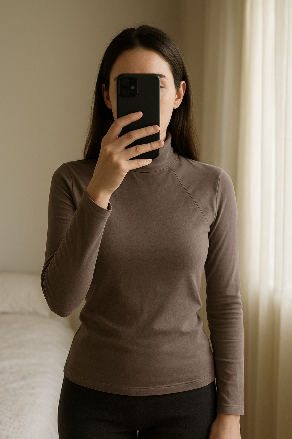 haut manches longues couleur Lila Zara debout, face à la caméra, dans une chambre à la lumière douce, avec une lumière naturelle filtrant par la fenêtre.