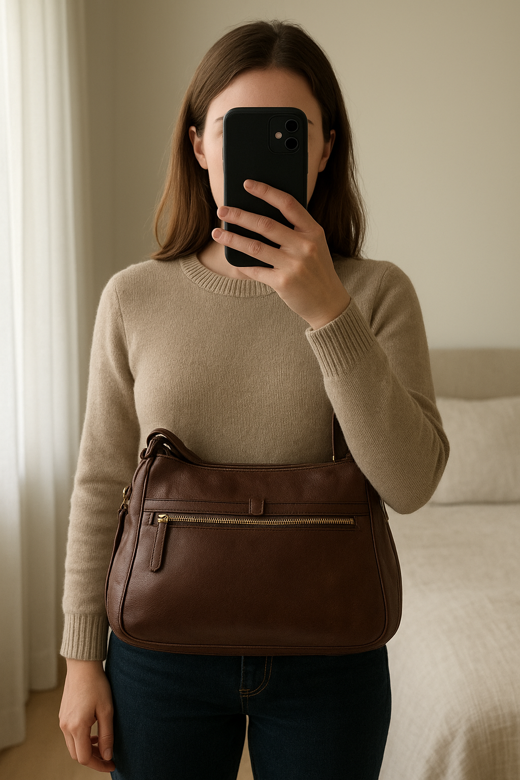 Hedgren schoudertas debout, face à la caméra, dans une chambre à la lumière douce, avec une lumière naturelle filtrant par la fenêtre.