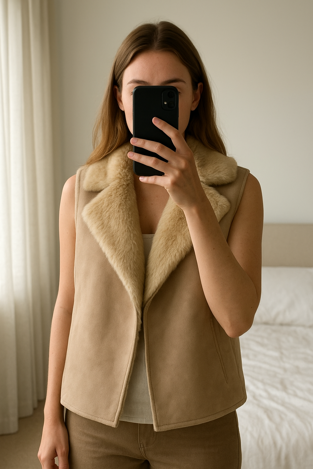 Hobbs faux fur beige gilet - size 10 standing straight facing the camera, in a softly lit bedroom setting, with gentle natural light filtering through a window.
