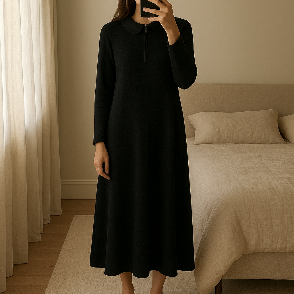 Hobbs Navy Tea Dress standing straight facing the camera, in a softly lit bedroom setting, with gentle natural light filtering through a window.