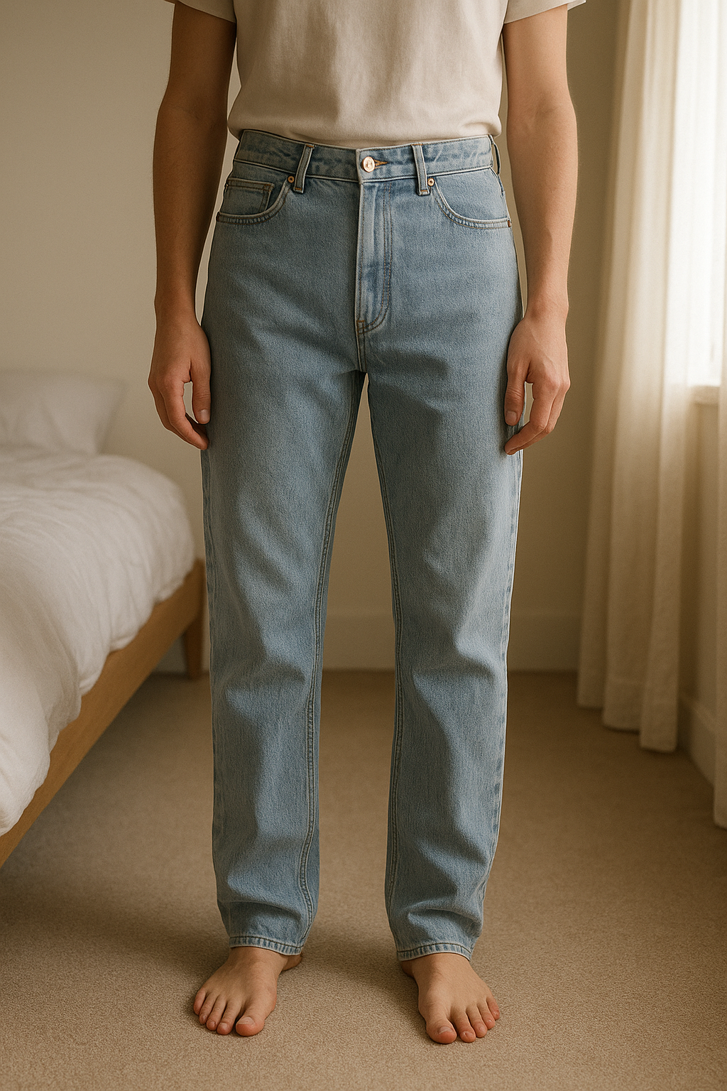 Jean bleu clair Calvin Klein 34 debout, face à la caméra, dans une chambre à la lumière douce, avec une lumière naturelle filtrant par la fenêtre.