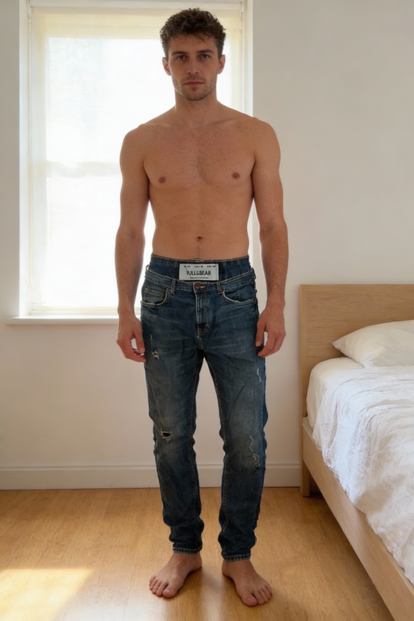 Jean bleu pull&bear debout, face à la caméra, dans une chambre à la lumière douce, avec une lumière naturelle filtrant par la fenêtre.
