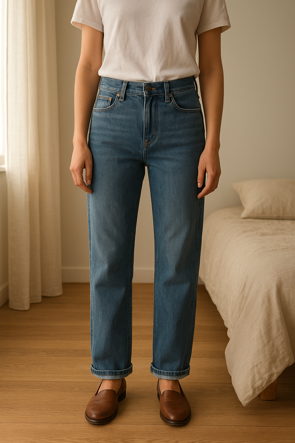 Jean droit Sud express debout, face à la caméra, dans une chambre à la lumière douce, avec une lumière naturelle filtrant par la fenêtre.