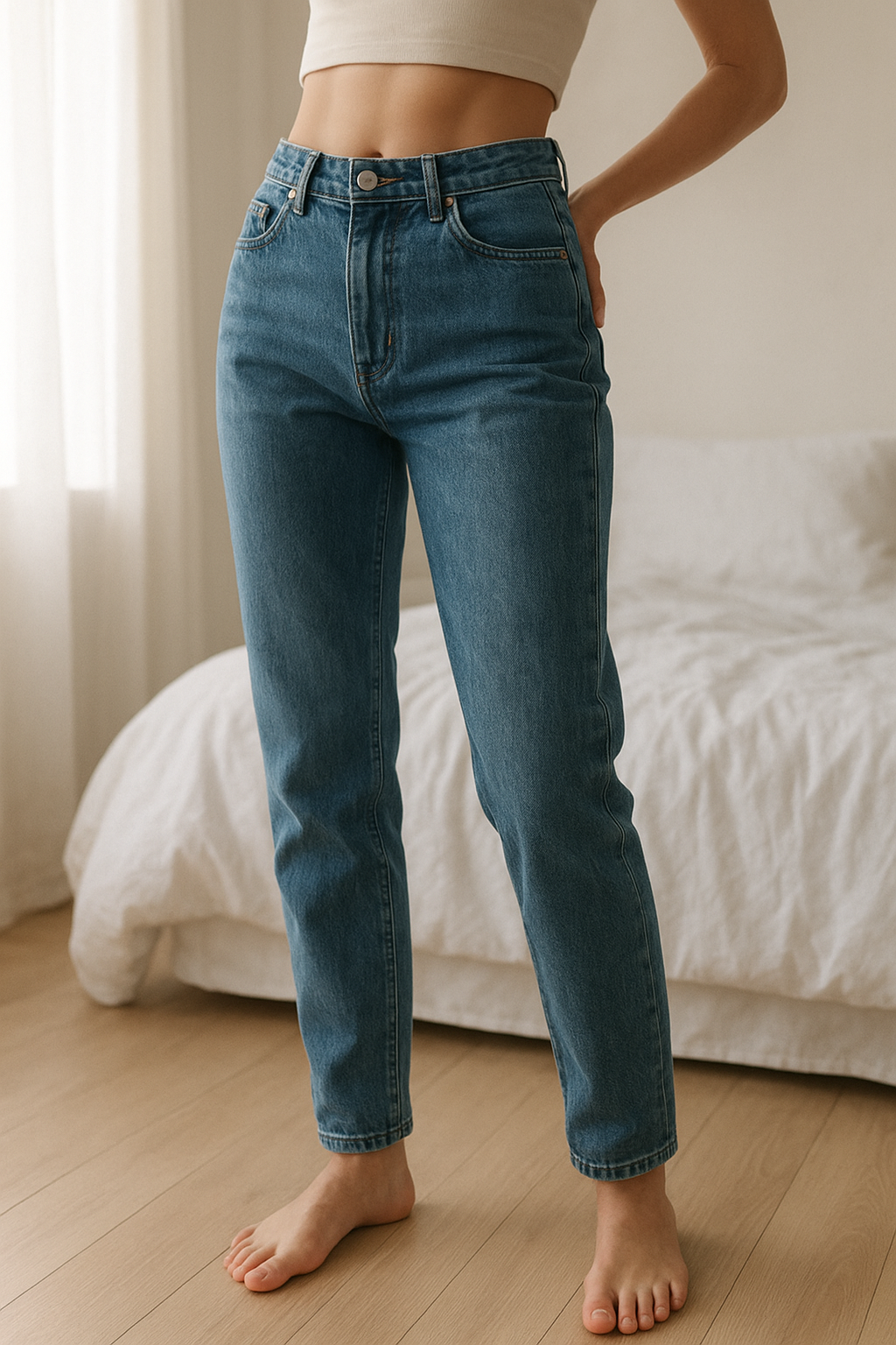 Une personne en Jean large / Baggy fit New Yorker bleu taille L femme cambrant légèrement le dos pour une pose dynamique, avec une silhouette fine, dans une chambre à la lumière douce, avec une lumière naturelle filtrant par la fenêtre.
