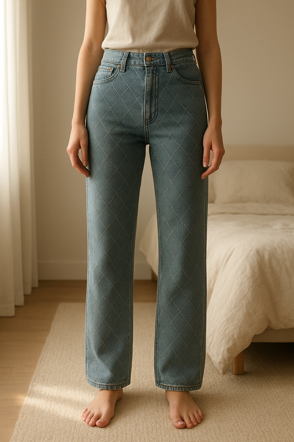 Jean pailletée debout, face à la caméra, dans une chambre à la lumière douce, avec une lumière naturelle filtrant par la fenêtre.