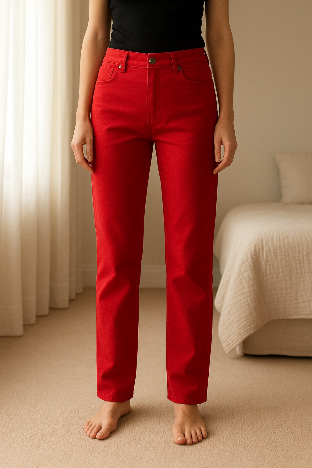 Jean rouge debout, face à la caméra, dans une chambre à la lumière douce, avec une lumière naturelle filtrant par la fenêtre.