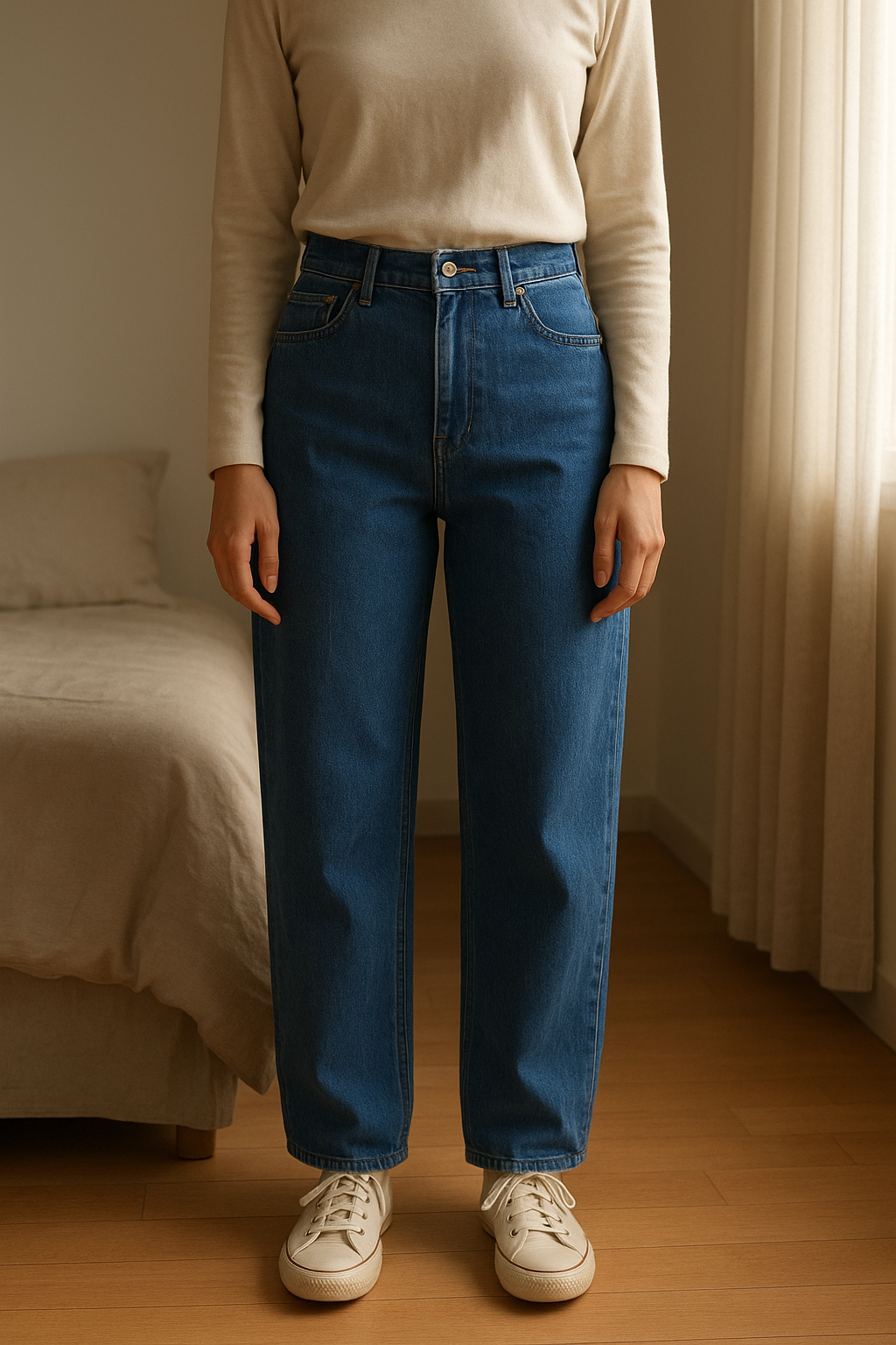 Jean sans bouton je le mets pas debout, face à la caméra, dans une chambre à la lumière douce, avec une lumière naturelle filtrant par la fenêtre.