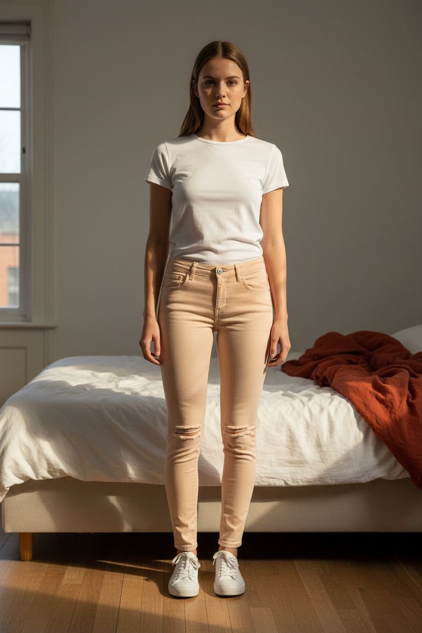 Jean skinny debout, face à la caméra, dans une chambre à la lumière douce, avec une lumière naturelle filtrant par la fenêtre.