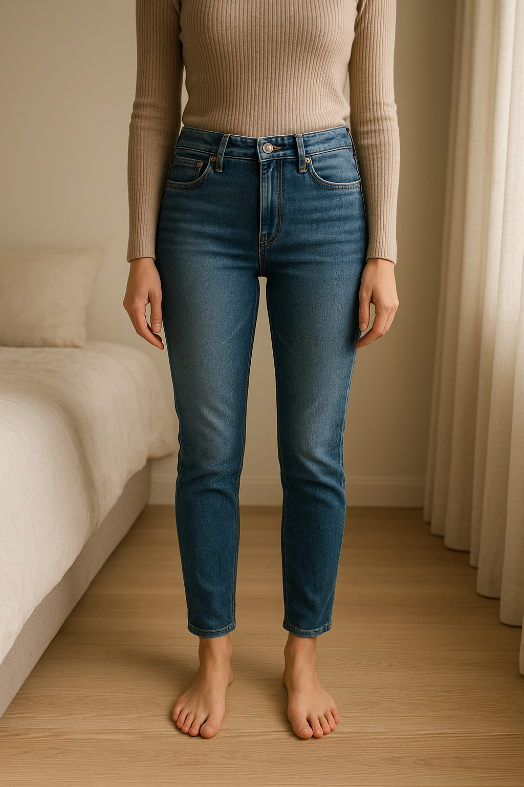 Jean skinny okaidi fille 8 ans debout, face à la caméra, dans une chambre à la lumière douce, avec une lumière naturelle filtrant par la fenêtre.