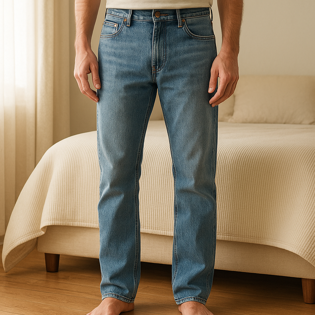 Jean slim Celio taille 40 debout, face à la caméra, dans une chambre à la lumière douce, avec une lumière naturelle filtrant par la fenêtre.