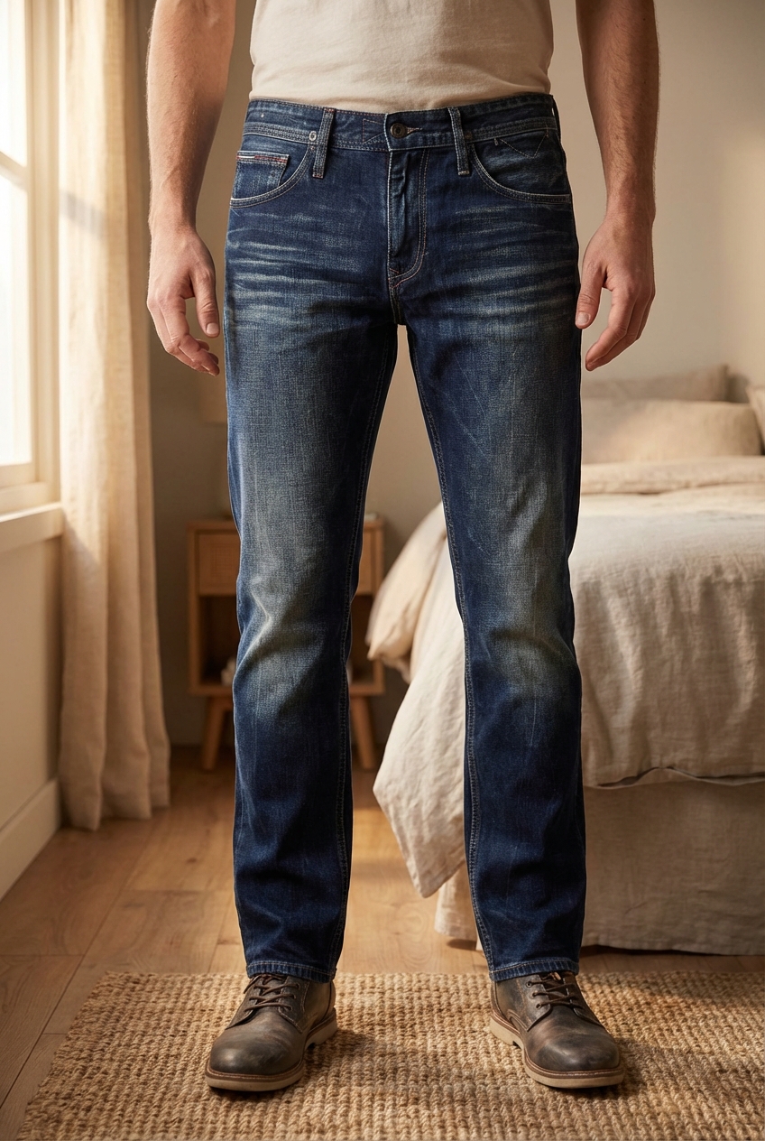 Jean tommy Hilfiger denim 31/34 debout, face à la caméra, dans une chambre à la lumière douce, avec une lumière naturelle filtrant par la fenêtre.