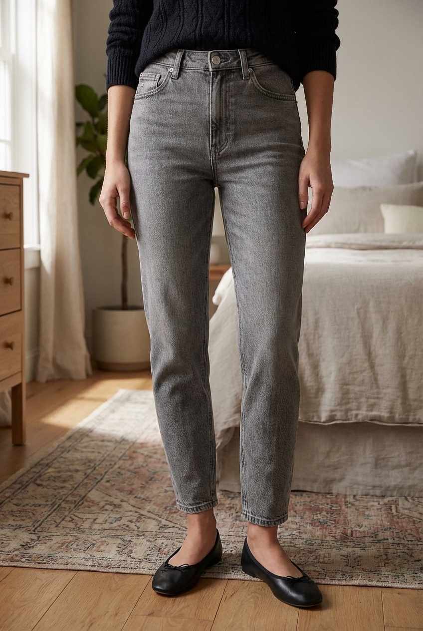 Jean Tommy Hilfiger Skinny debout, face à la caméra, dans une chambre à la lumière douce, avec une lumière naturelle filtrant par la fenêtre.
