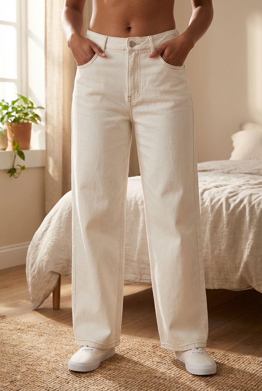Une personne en Jean Wide Leg taille haute T36 debout, face à la caméra, dans une chambre à la lumière douce, avec une lumière naturelle filtrant par la fenêtre.