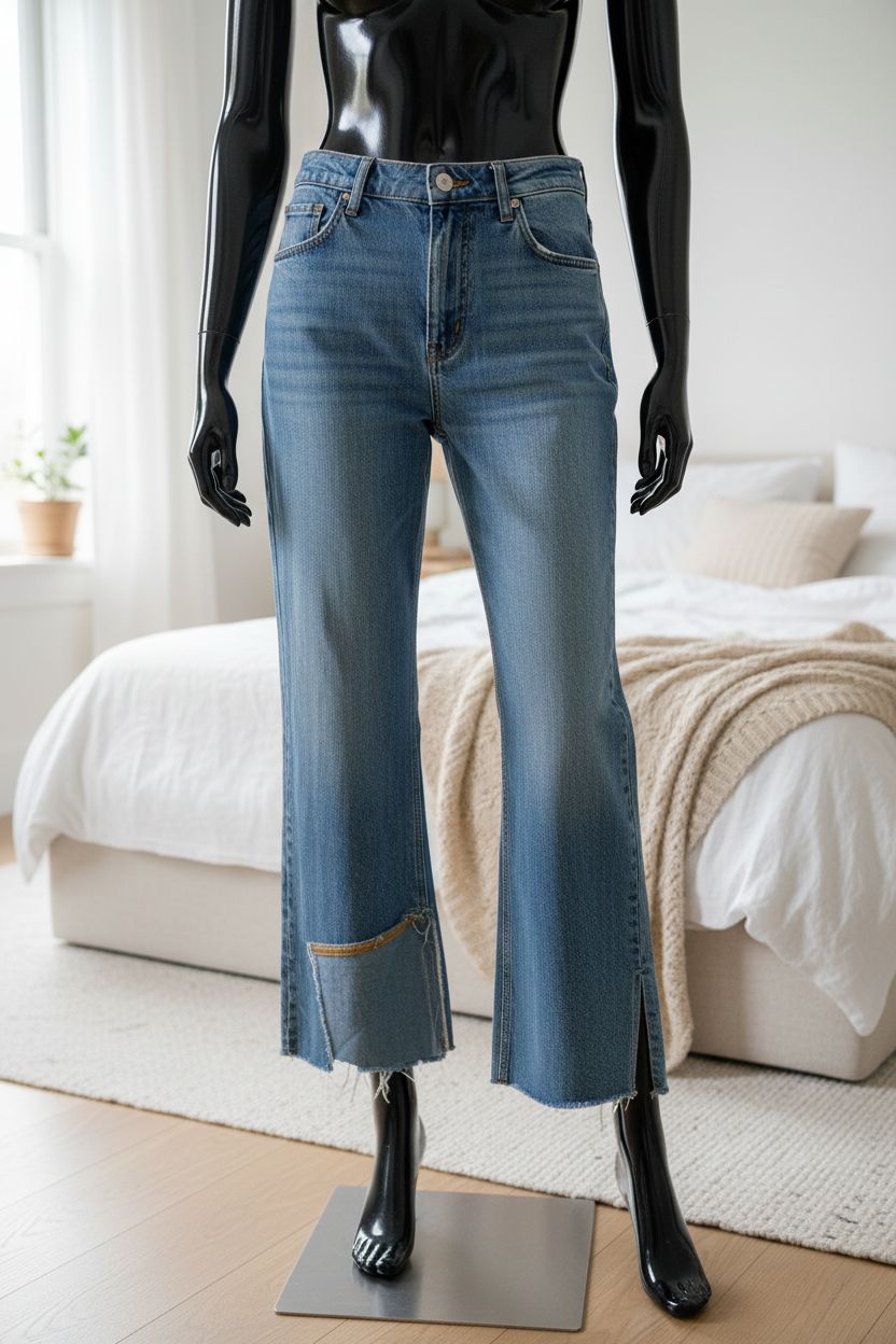 un mannequin noir brillant en plastique, sans traits du visage en Jean Zara droit taille haute 36 debout, face à la caméra, dans une chambre à la lumière douce, avec une lumière naturelle filtrant par la fenêtre.