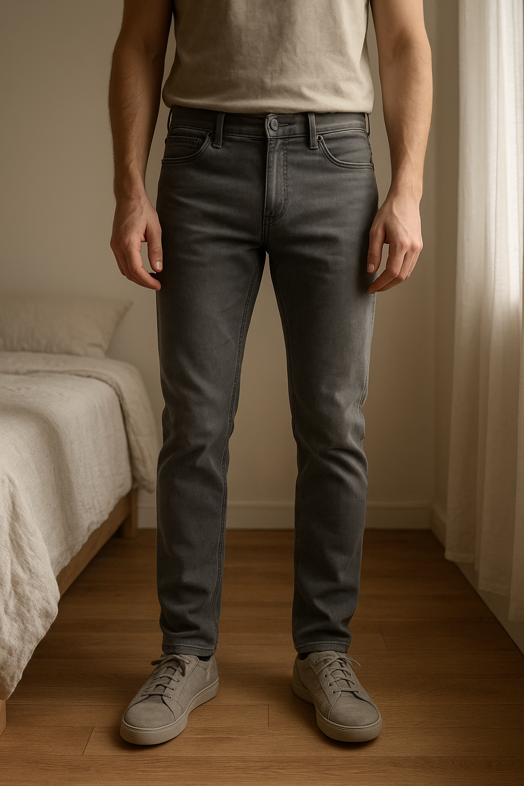 Jeans gris homme kiabi debout, face à la caméra, dans une chambre à la lumière douce, avec une lumière naturelle filtrant par la fenêtre.