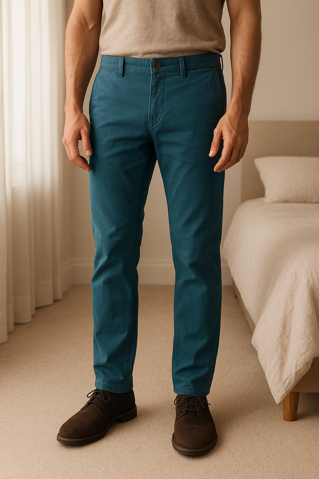 Jeans homme kiabi debout, face à la caméra, dans une chambre à la lumière douce, avec une lumière naturelle filtrant par la fenêtre.