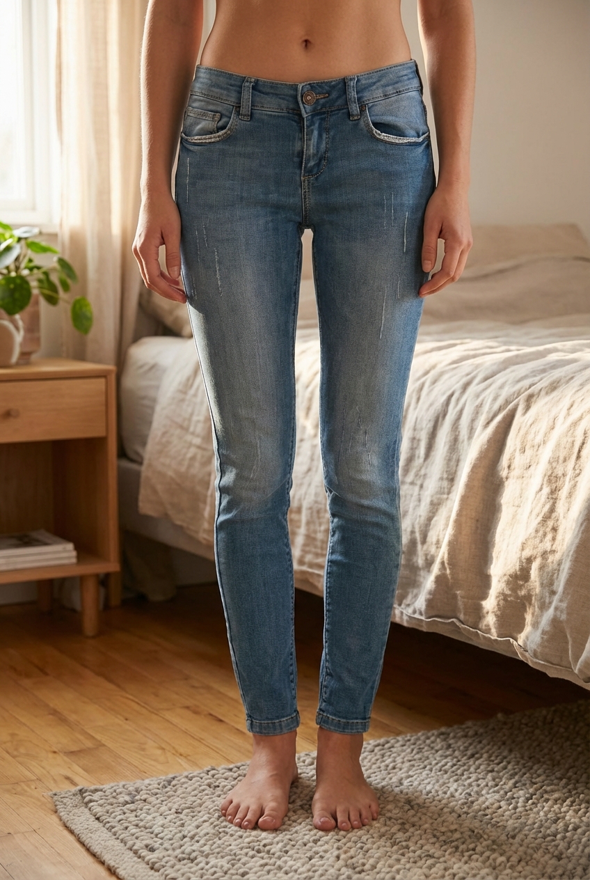 Jeans skinny Only taille 36 debout, face à la caméra, dans une chambre à la lumière douce, avec une lumière naturelle filtrant par la fenêtre.