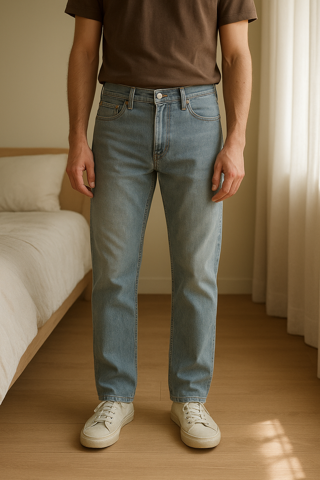 Jeans slim 511 debout, face à la caméra, dans une chambre à la lumière douce, avec une lumière naturelle filtrant par la fenêtre.