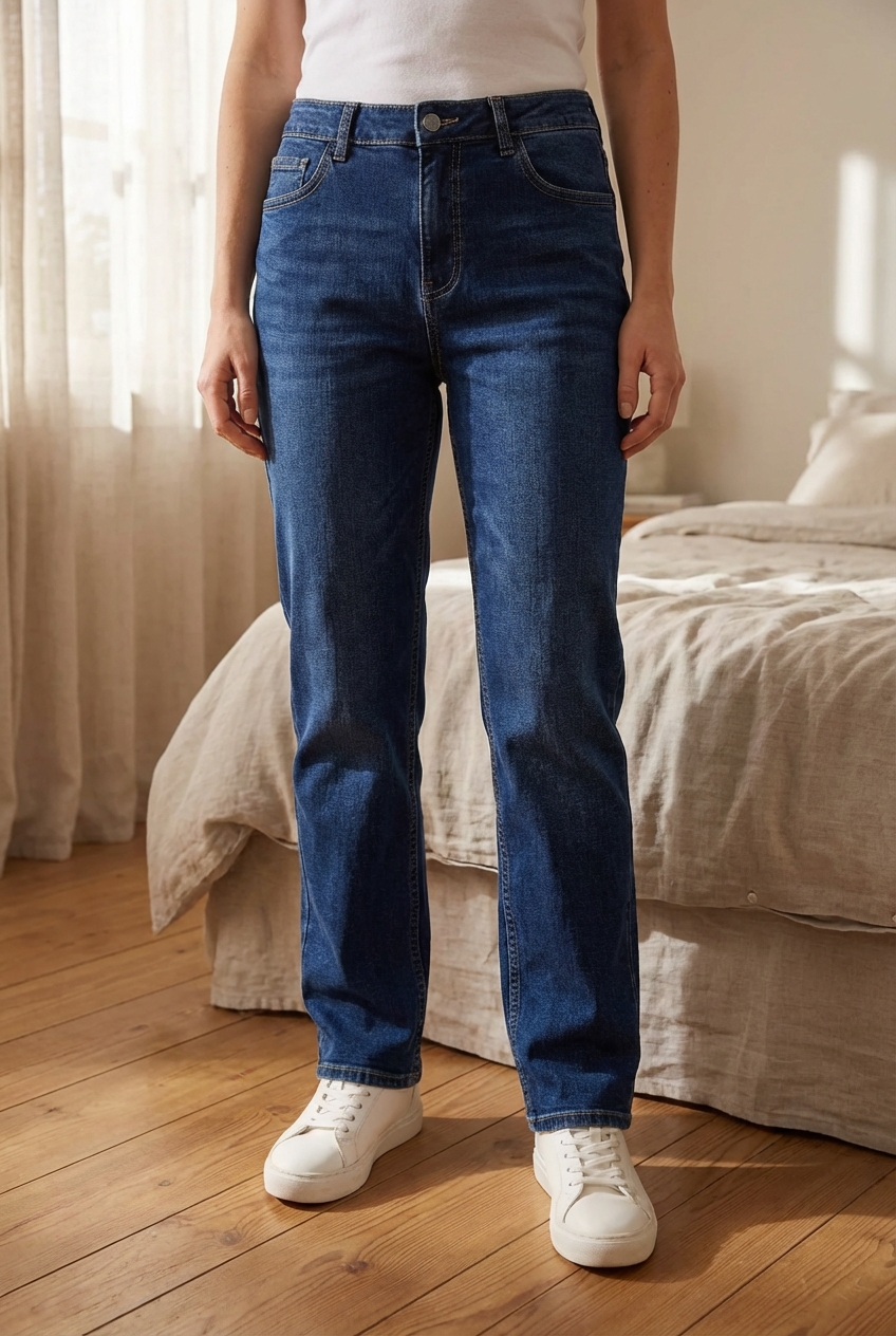 Jeans taille 44 in extenso debout, face à la caméra, dans une chambre à la lumière douce, avec une lumière naturelle filtrant par la fenêtre.