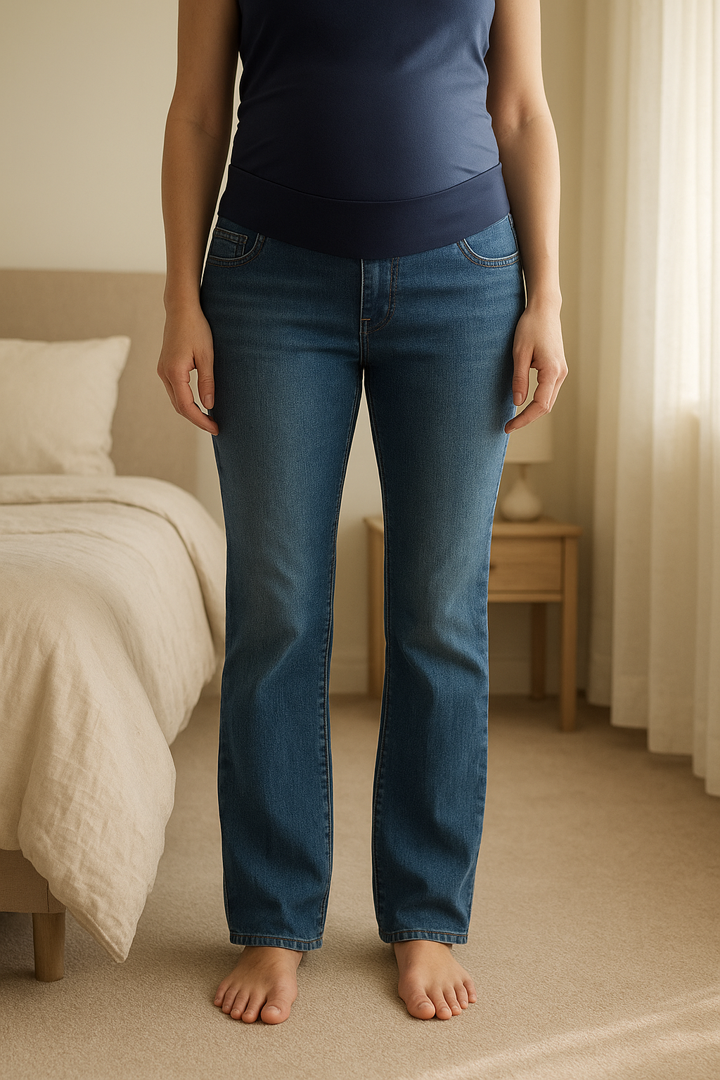 Jegging grossesse debout, face à la caméra, dans une chambre à la lumière douce, avec une lumière naturelle filtrant par la fenêtre.