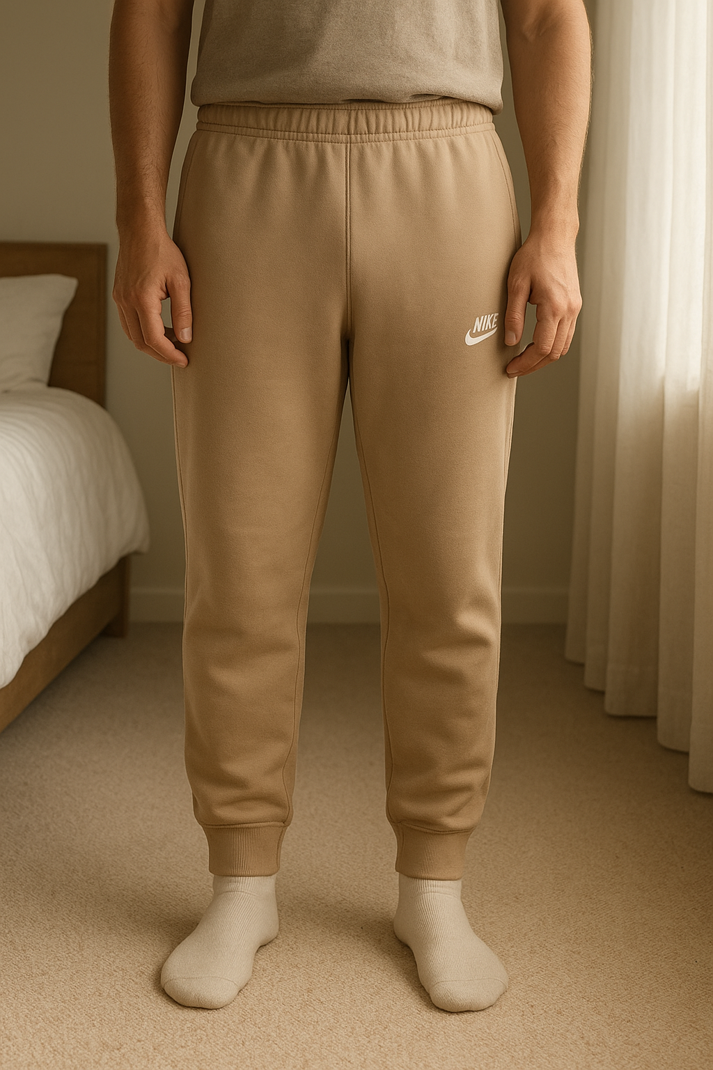 Jogging Nike beige / crème – Taille XXL – Bon état debout, face à la caméra, dans une chambre à la lumière douce, avec une lumière naturelle filtrant par la fenêtre.