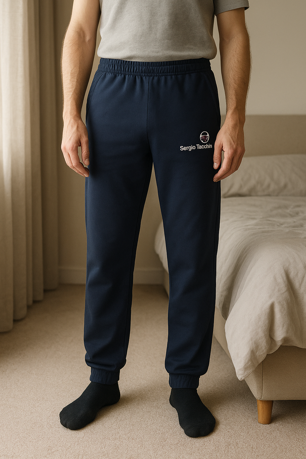 Jogging Sergio Tacchini debout, face à la caméra, dans une chambre à la lumière douce, avec une lumière naturelle filtrant par la fenêtre.