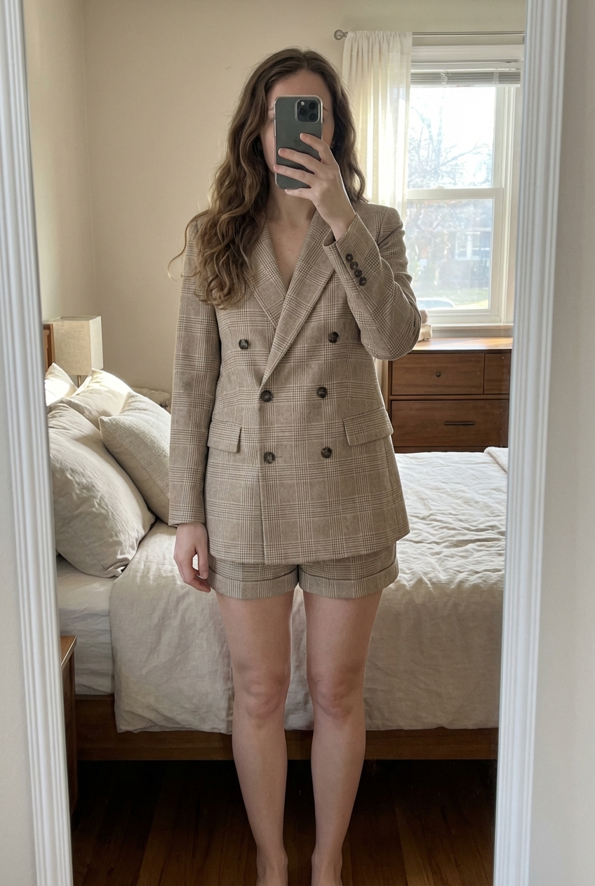 Jolie ensemble short de pie, mirando a la cámara, en un dormitorio con luz suave y natural filtrándose por la ventana.