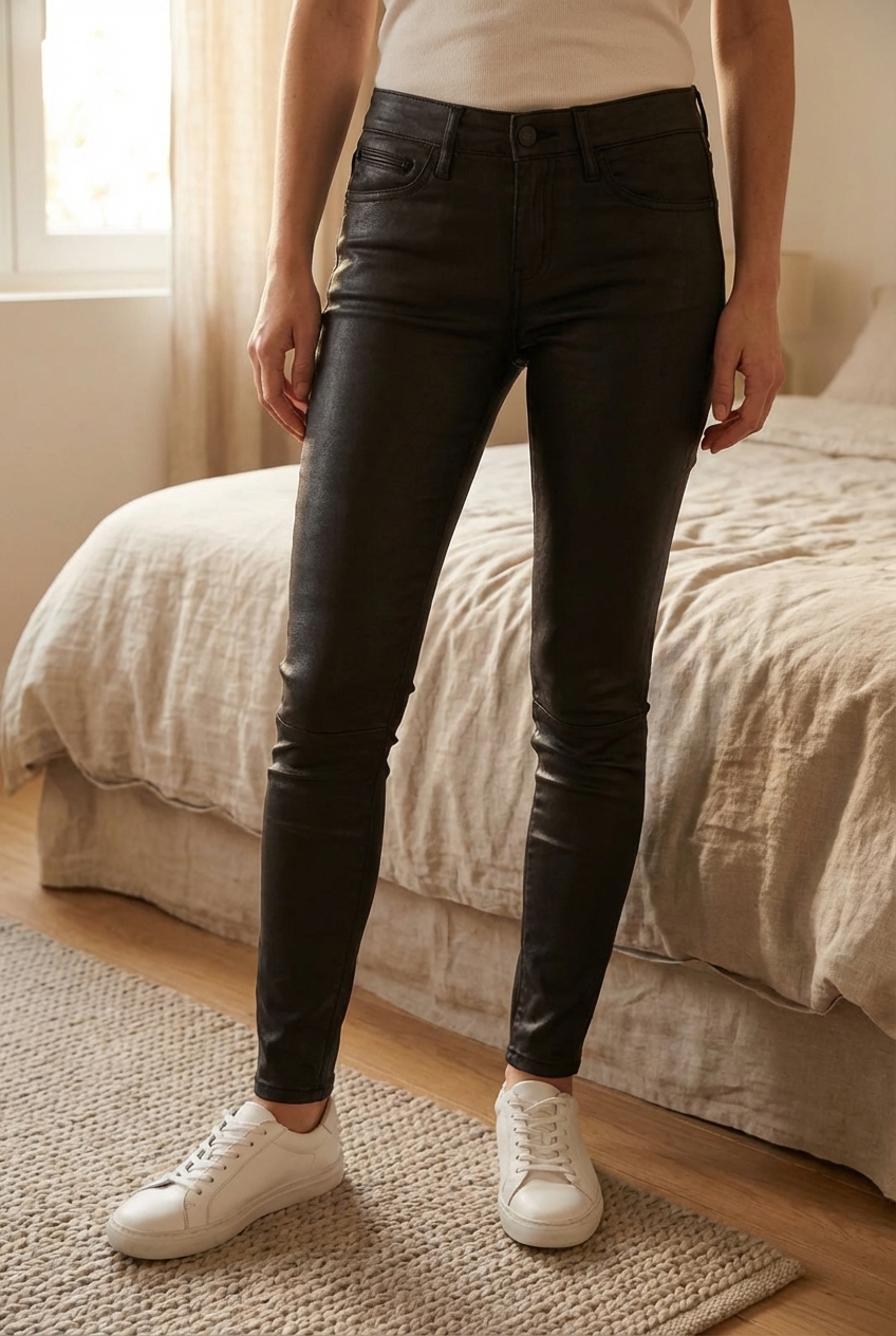 Jolie pantalon cuir de pie, mirando a la cámara, en un dormitorio con luz suave y natural filtrándose por la ventana.