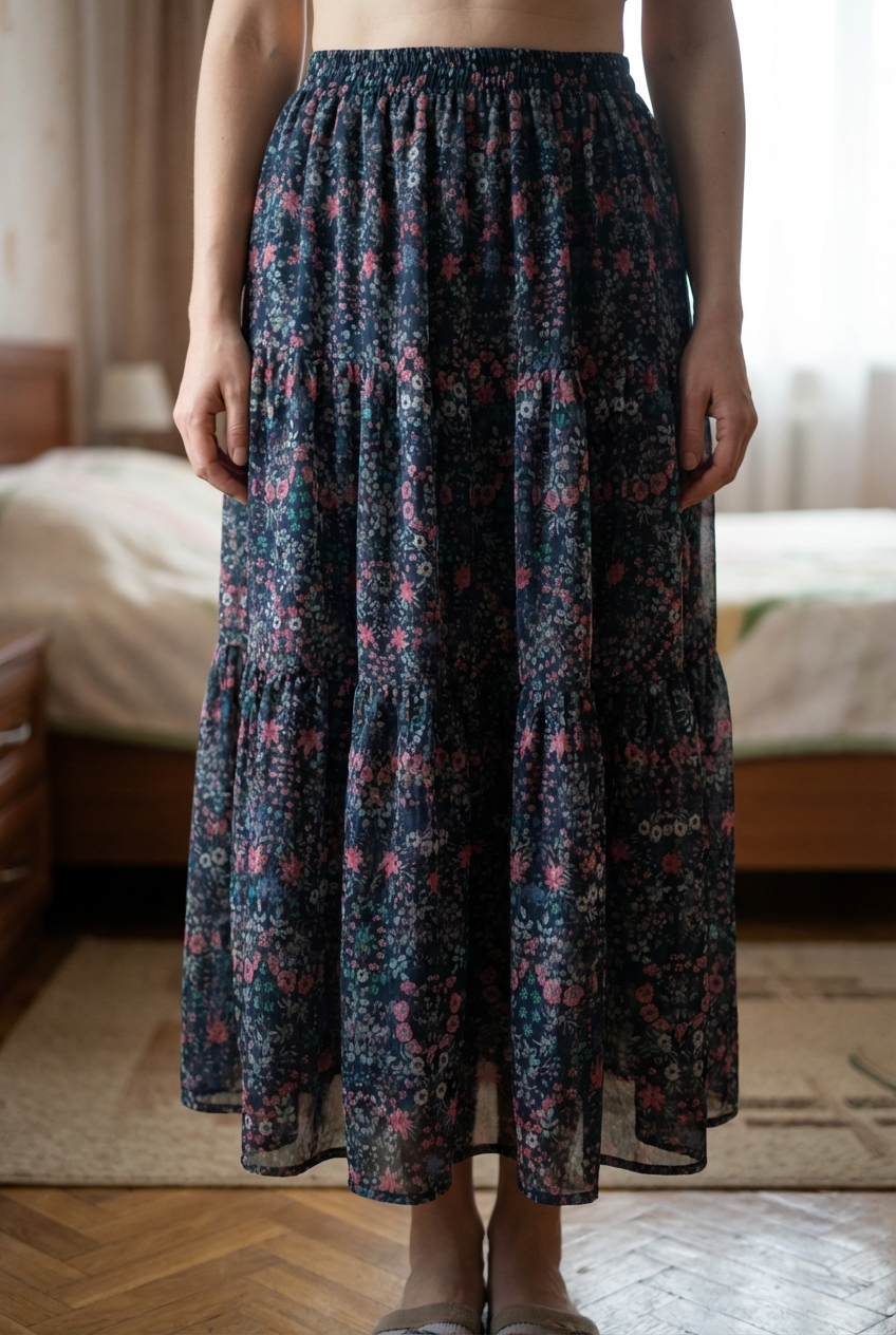 Jupe a fleur debout, face à la caméra, dans une chambre à la lumière douce, avec une lumière naturelle filtrant par la fenêtre.