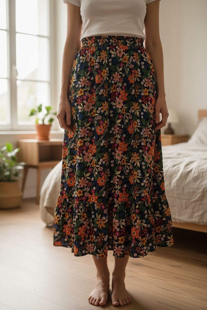 Jupe longue d'été, fleurie, bohème debout, face à la caméra, dans une chambre à la lumière douce, avec une lumière naturelle filtrant par la fenêtre.