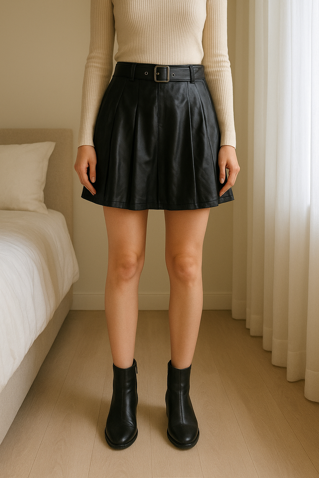 Jupe Mini Plissée KIABI Noire Simili Cuir debout, face à la caméra, dans une chambre à la lumière douce, avec une lumière naturelle filtrant par la fenêtre.