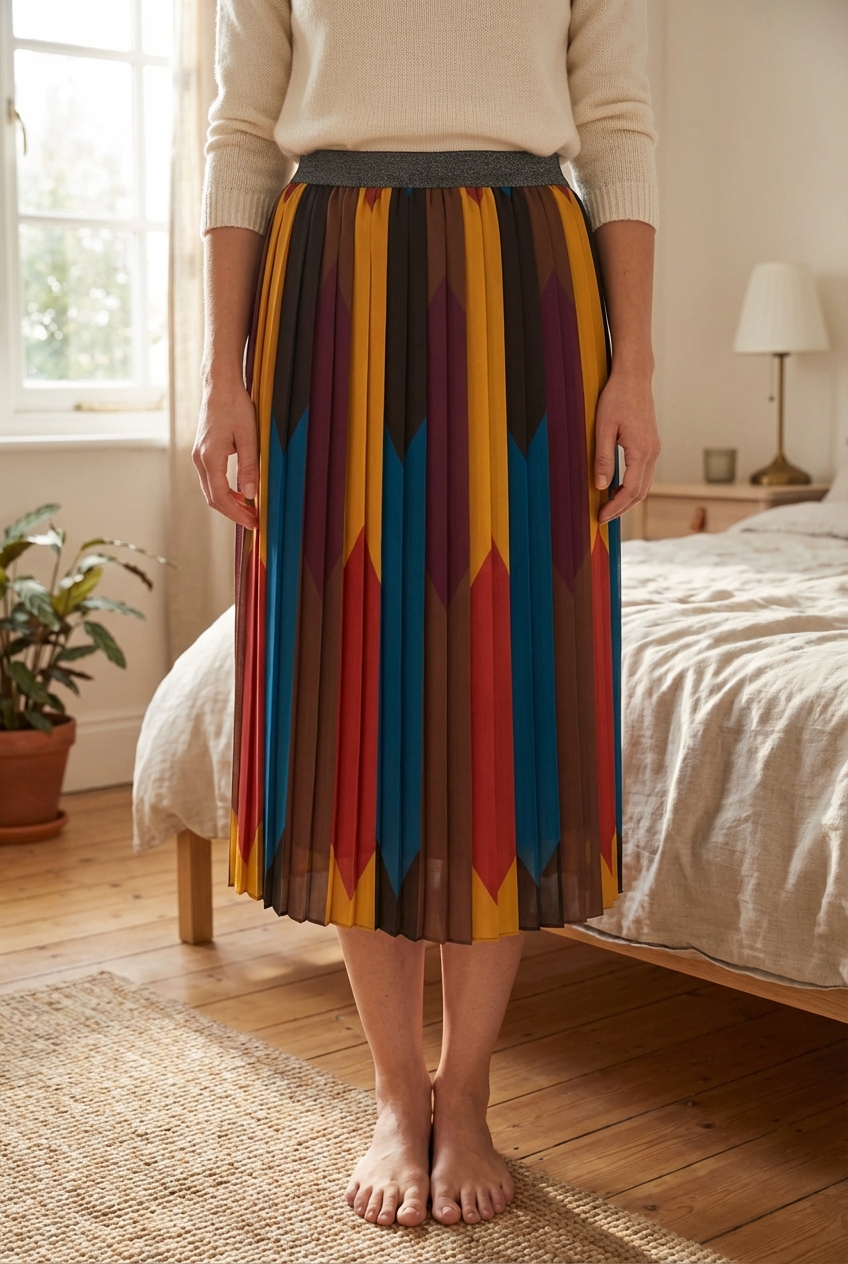 Jupe plissée multicolore Trucco - neuve de pie, mirando a la cámara, en un dormitorio con luz suave y natural filtrándose por la ventana.