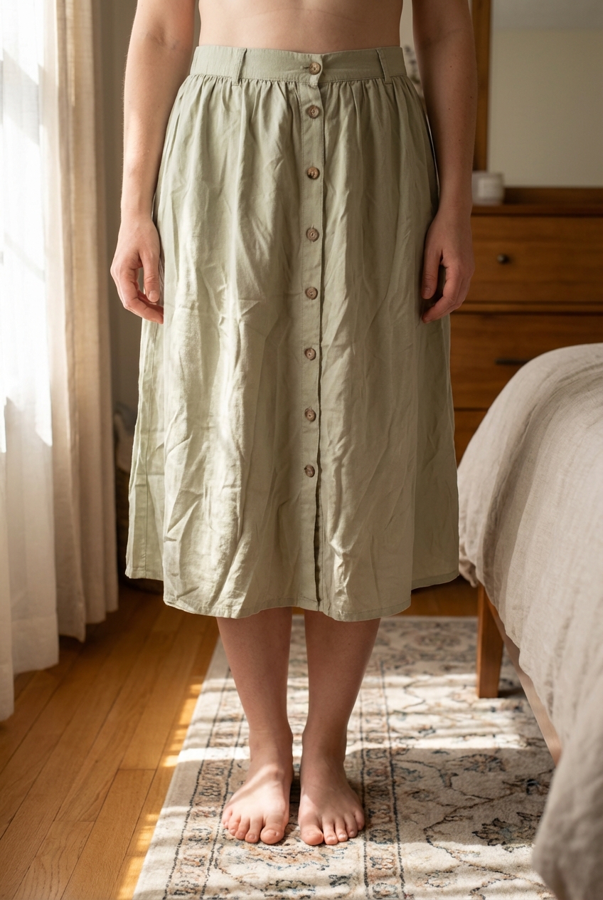 Jupe vert in Extenso debout, face à la caméra, dans une chambre à la lumière douce, avec une lumière naturelle filtrant par la fenêtre.