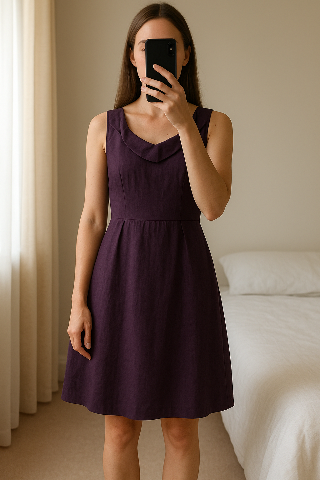 Kaliko 90% Linen Cocktail Dress | Size 16 standing straight facing the camera, in a softly lit bedroom setting, with gentle natural light filtering through a window.