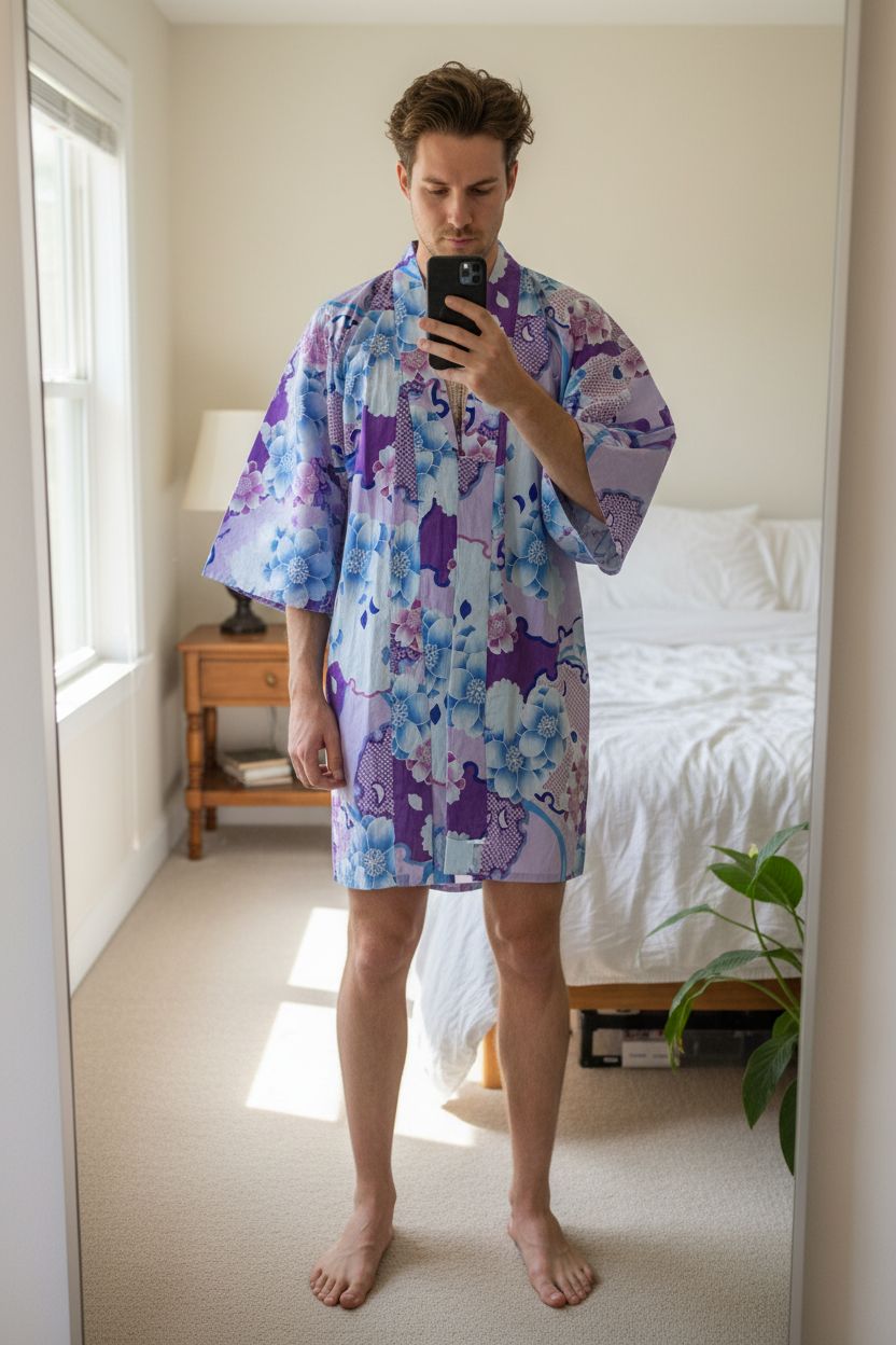 Une personne en Kimono, Yukata fleurs rose violet japonais léger unique - comme neuf - envoi rapide debout, face à la caméra, dans une chambre à la lumière douce, avec une lumière naturelle filtrant par la fenêtre.