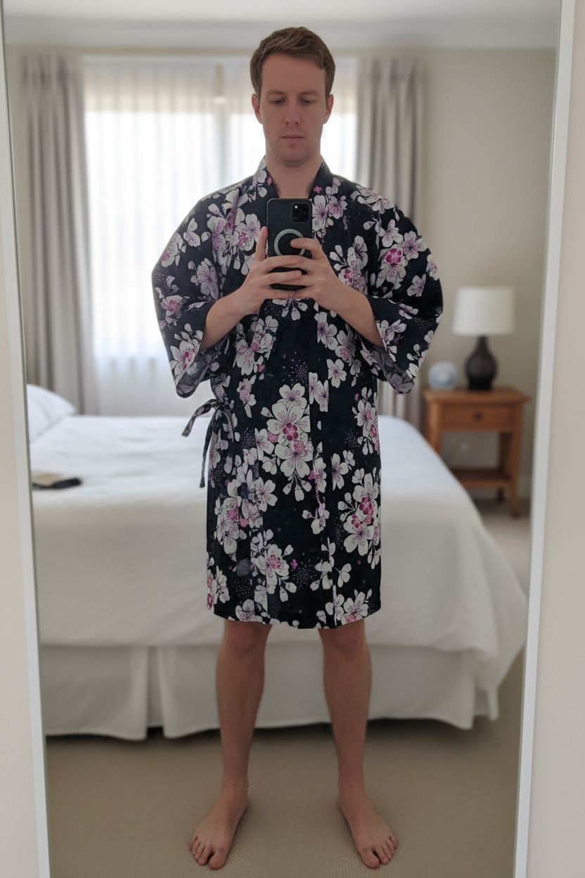 Une personne en Kimono Yukata fleurs sakura noir rose japonais léger unique - comme neuf - envoi rapide debout, face à la caméra, dans une chambre à la lumière douce, avec une lumière naturelle filtrant par la fenêtre.
