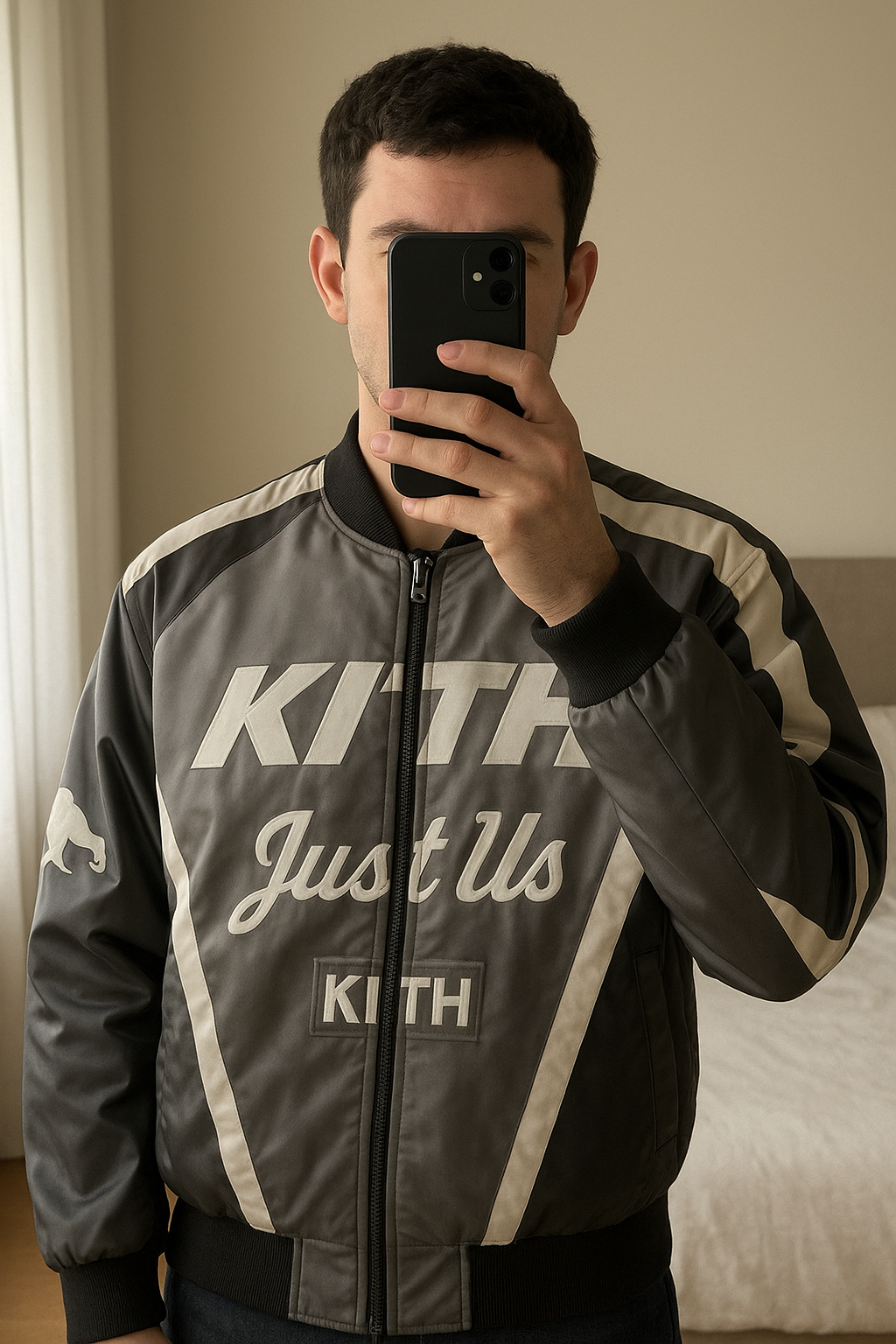 Kith Veste Bomber Racing en Nylon debout, face à la caméra, dans une chambre à la lumière douce, avec une lumière naturelle filtrant par la fenêtre.