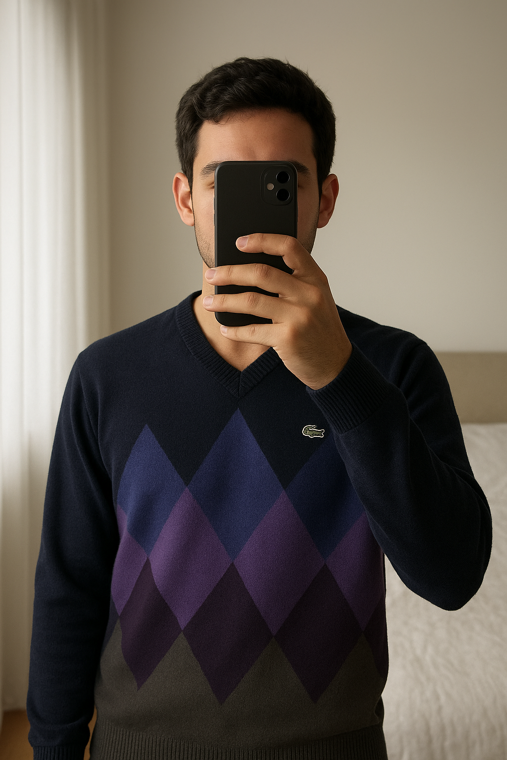 Lacoste Wool Vintage Sweater V-Neck Blue Purple Grey Y2K Made in Spain de pie, mirando a la cámara, en un dormitorio con luz suave y natural filtrándose por la ventana.