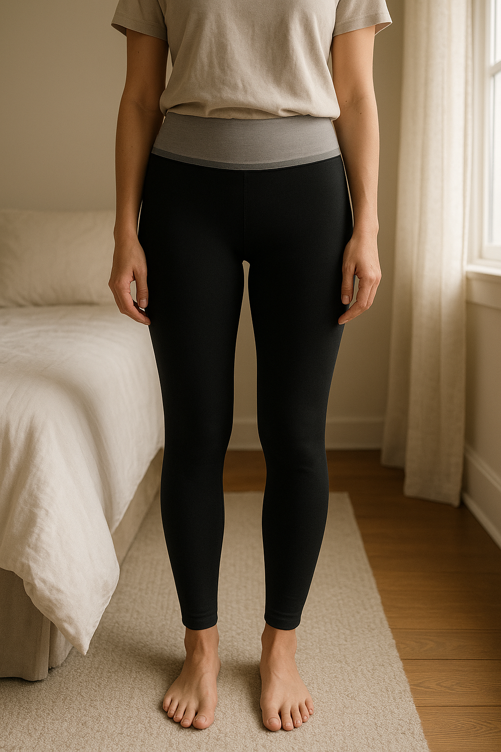 Leggings lululemon noir Taille 4 - SKU 70 debout, face à la caméra, dans une chambre à la lumière douce, avec une lumière naturelle filtrant par la fenêtre.