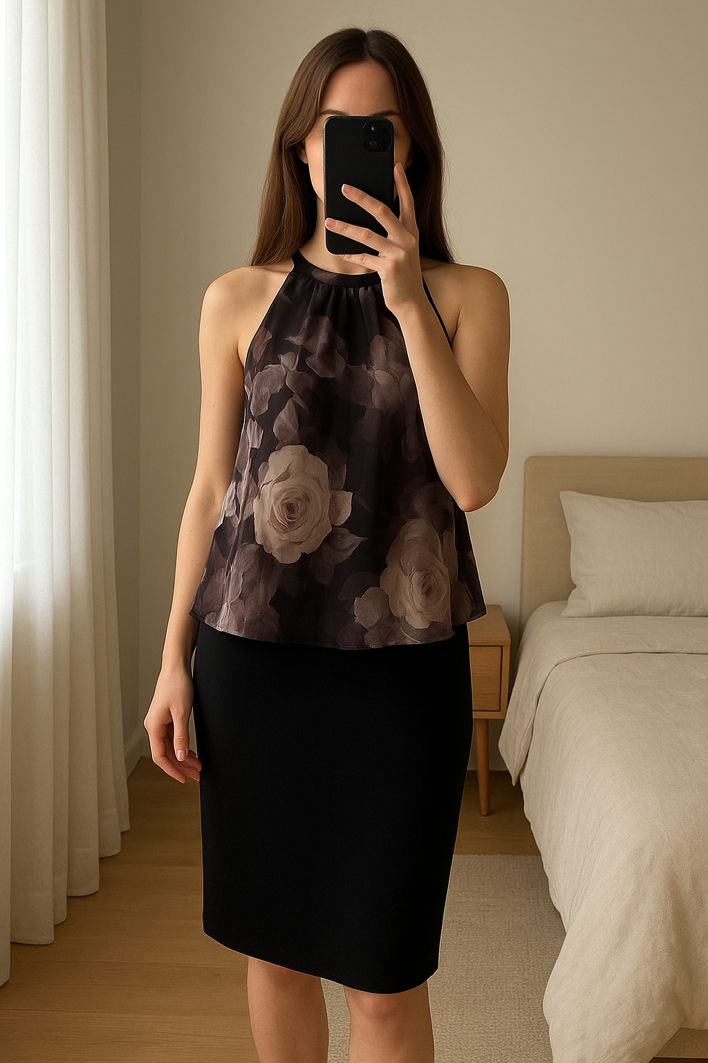 Lipsy Dress | Size 12 | Never Worn standing straight facing the camera, in a softly lit bedroom setting, with gentle natural light filtering through a window.