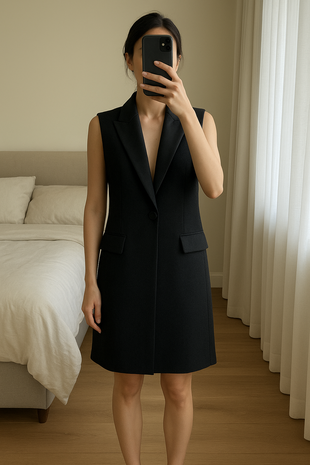 Long Blazer Noir sans Manches Zara - 33% Laine - Taille 36/S debout, face à la caméra, dans une chambre à la lumière douce, avec une lumière naturelle filtrant par la fenêtre.