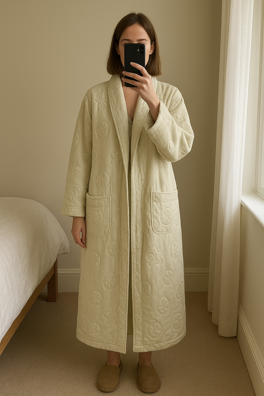 Long peignoir femme pale canda taille L debout, face à la caméra, dans une chambre à la lumière douce, avec une lumière naturelle filtrant par la fenêtre.