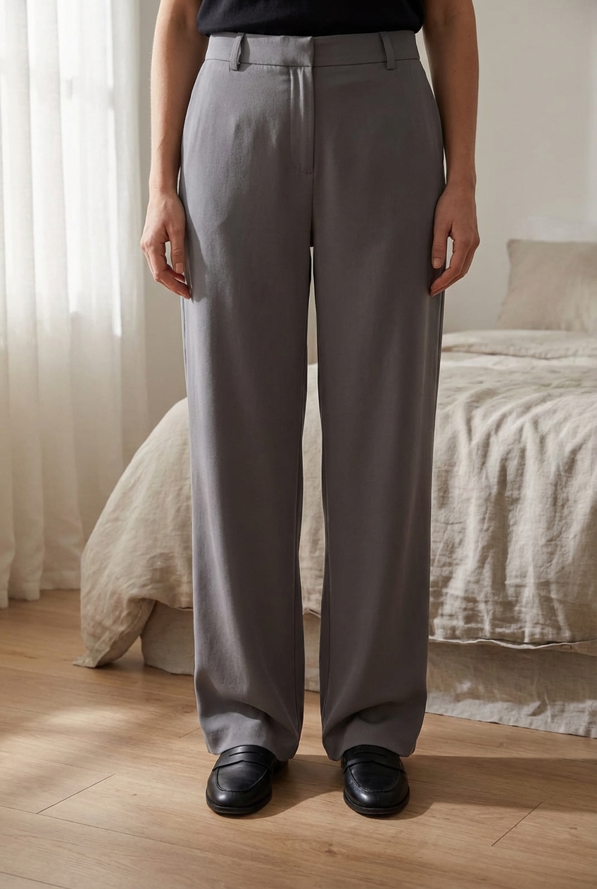 Lot 2 jupe debout, face à la caméra, dans une chambre à la lumière douce, avec une lumière naturelle filtrant par la fenêtre.