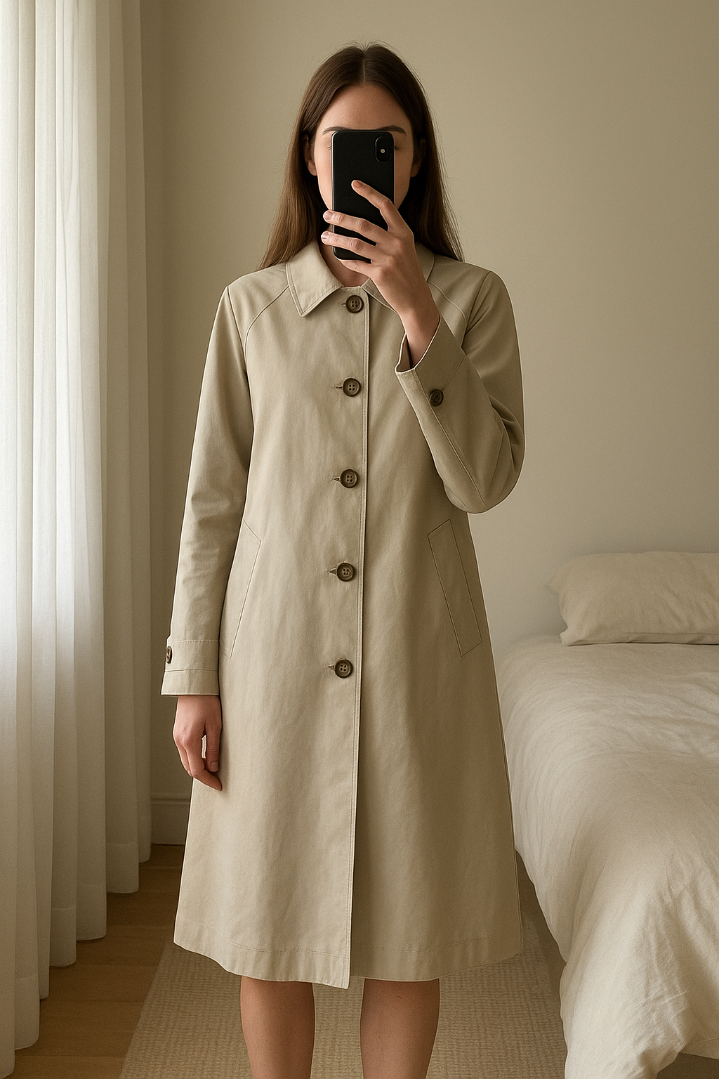 M&S Collection Cotton Rich Stormwear Car Coat | Size 14 standing straight facing the camera, in a softly lit bedroom setting, with gentle natural light filtering through a window.