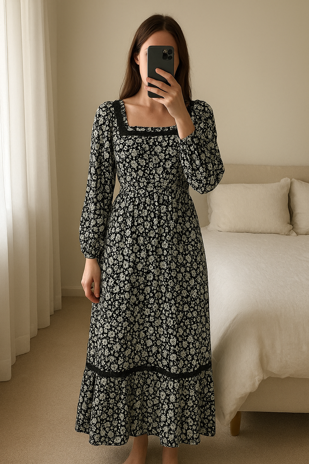 M&S smock maxi dress black white floral UK 14 standing straight facing the camera, in a softly lit bedroom setting, with gentle natural light filtering through a window.