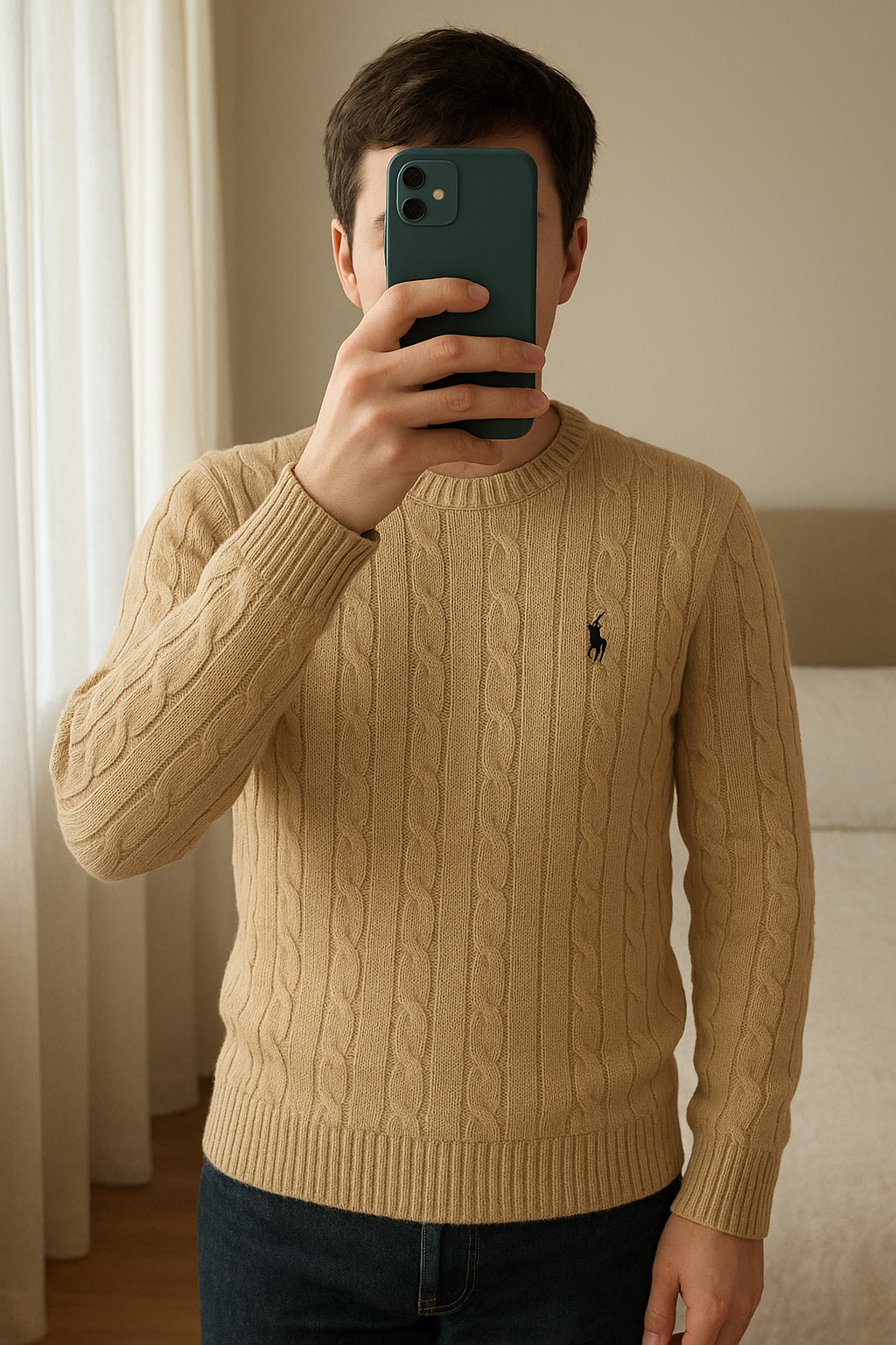 Maglione Ralph Lauren Uomo Donna Unisex Beige in piedi, rivolto verso la fotocamera, in una camera da letto con luce soffusa e luce naturale che filtra dalla finestra.