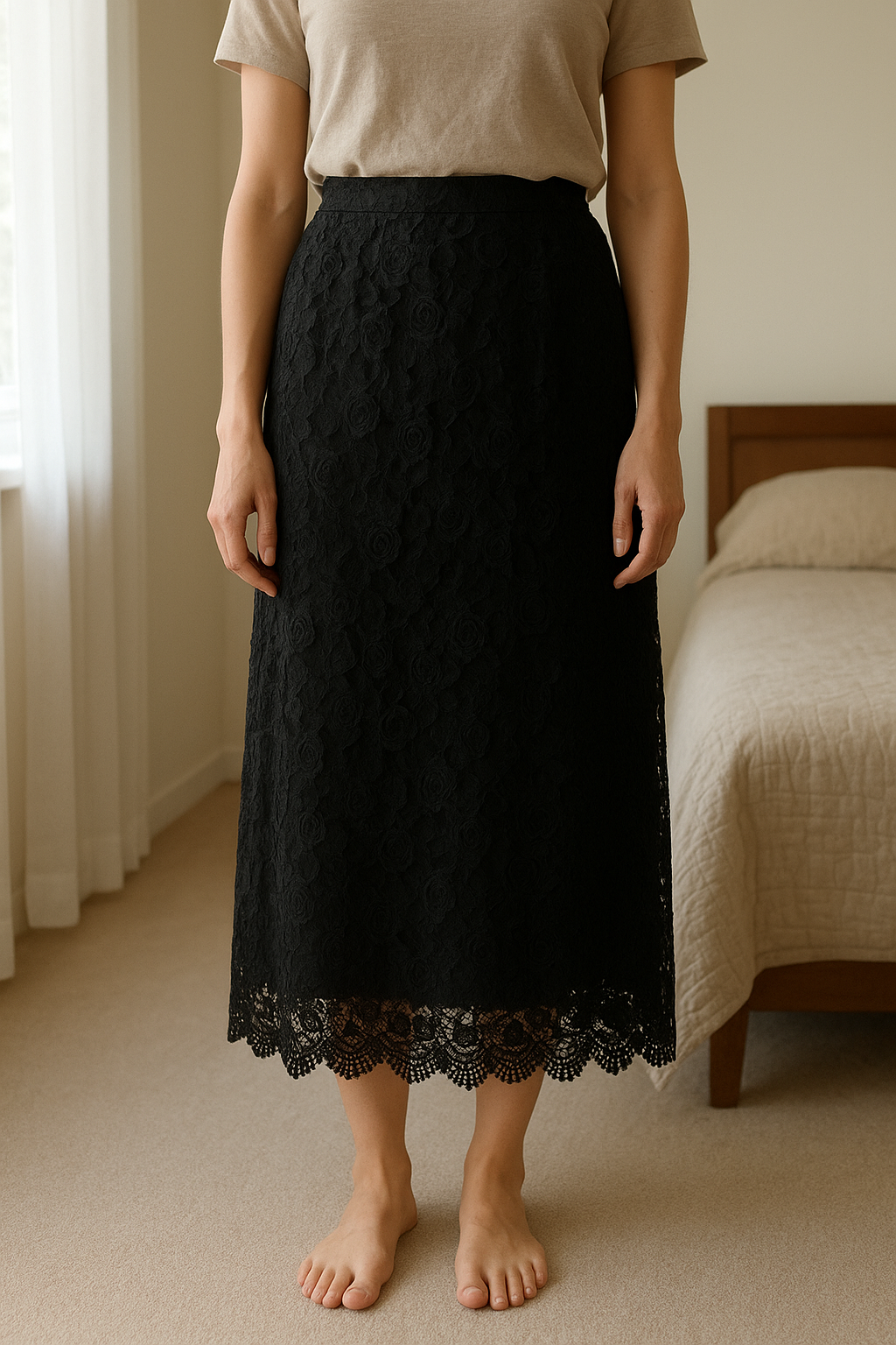 Magnifique Jupe Droite En dentelle Noire debout, face à la caméra, dans une chambre à la lumière douce, avec une lumière naturelle filtrant par la fenêtre.