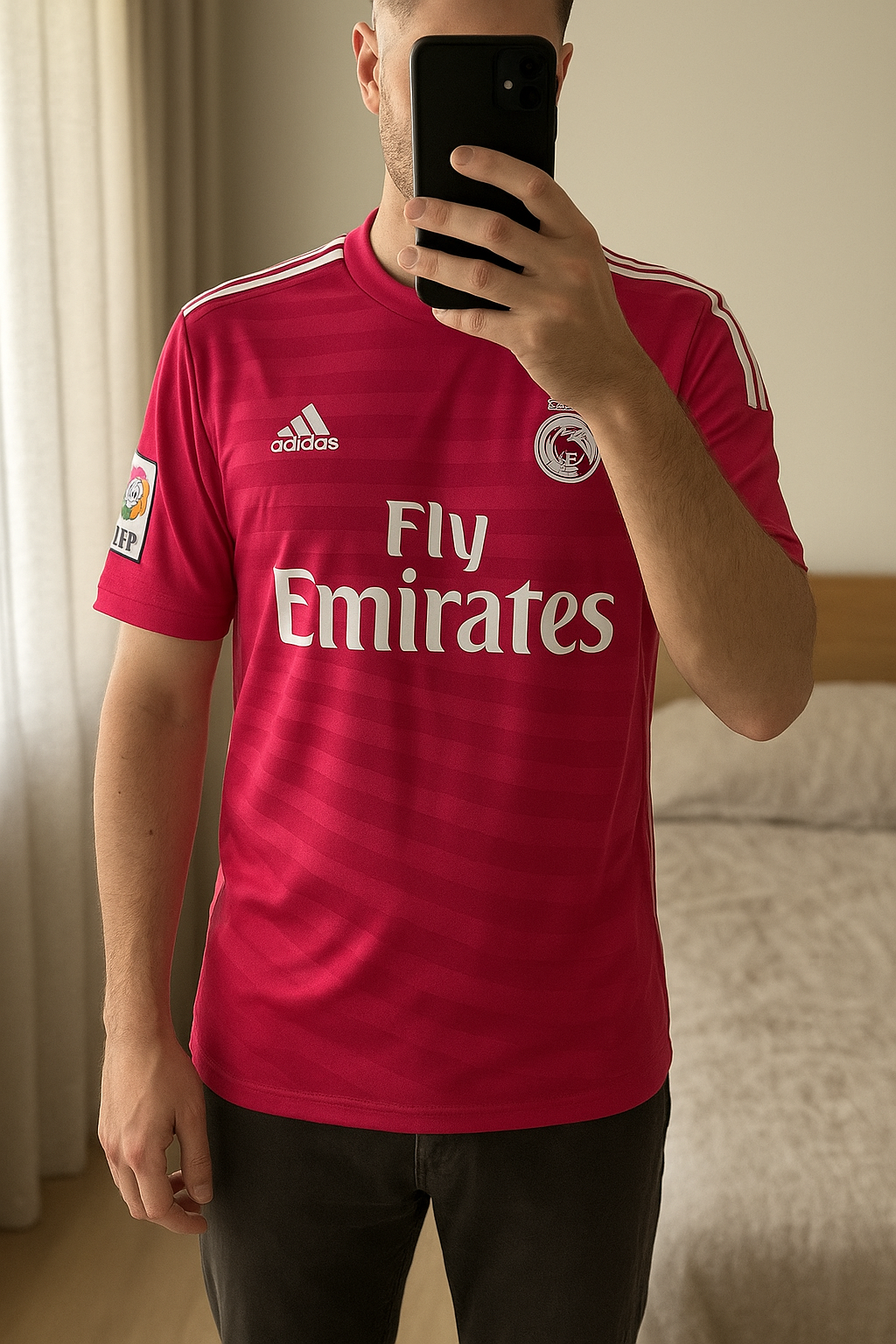 Maillot de foot Réal Madrid debout, face à la caméra, dans une chambre à la lumière douce, avec une lumière naturelle filtrant par la fenêtre.