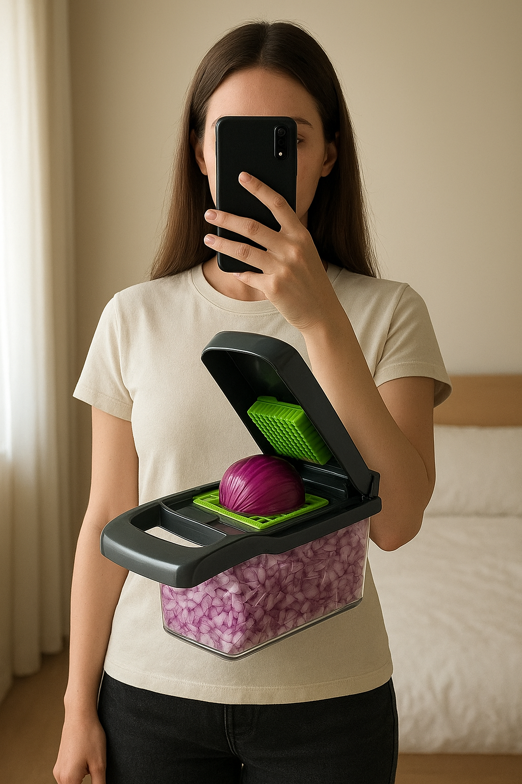 Mandoline 14 en 1 debout, face à la caméra, dans une chambre à la lumière douce, avec une lumière naturelle filtrant par la fenêtre.